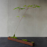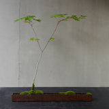 アイアン鉢の直線美とカエデのしなやかな立ち姿は、モダンな自然美として洗練された景色を見せてくれます。