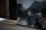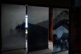 この作品は、手漉きの和紙に描かれ、伝統的な日本建築の空間に設置されています。